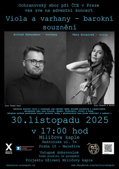 Ochranovský sbor při ČCE v Praze Vás zve na 1. adventní koncert Viola a varhany - barokní souznění, 30. listopadu 2025 v 17 hod., Milíčova kaple