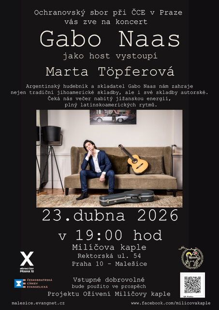 Ochranovský sbor při ČCE v Praze Vás zve na koncert Gabo Naas, jako host vystoupí Marta Töpferová, 23. dubna 2026 v 19. hod, Milíčova kaple